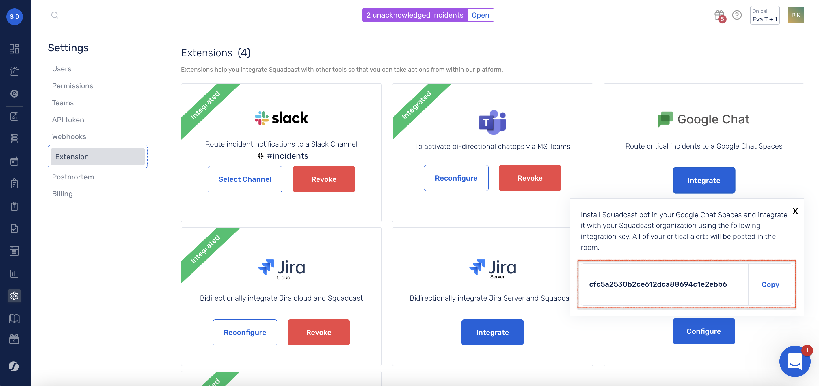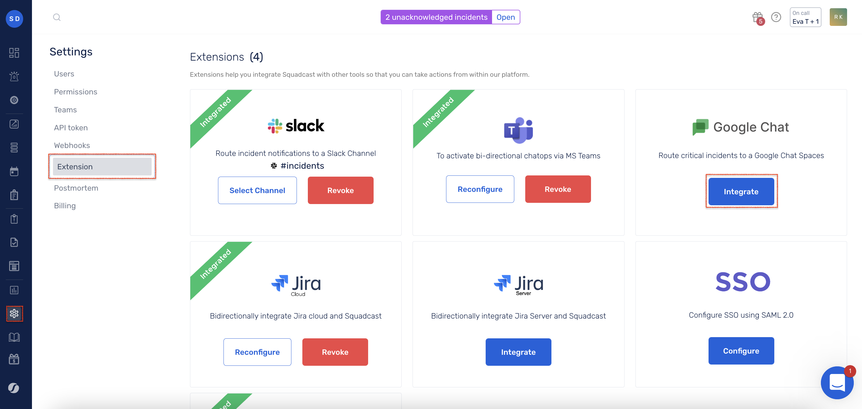 * Only the Account Owner and Users with the <mark style="color:red;">`Manage Extensions`</mark> permission will be able to enable, disable and manage Extensions in Squadcast