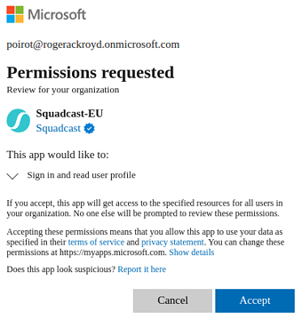 1. **The user will need to grant admin consent to the Squadcast bot permissions.**