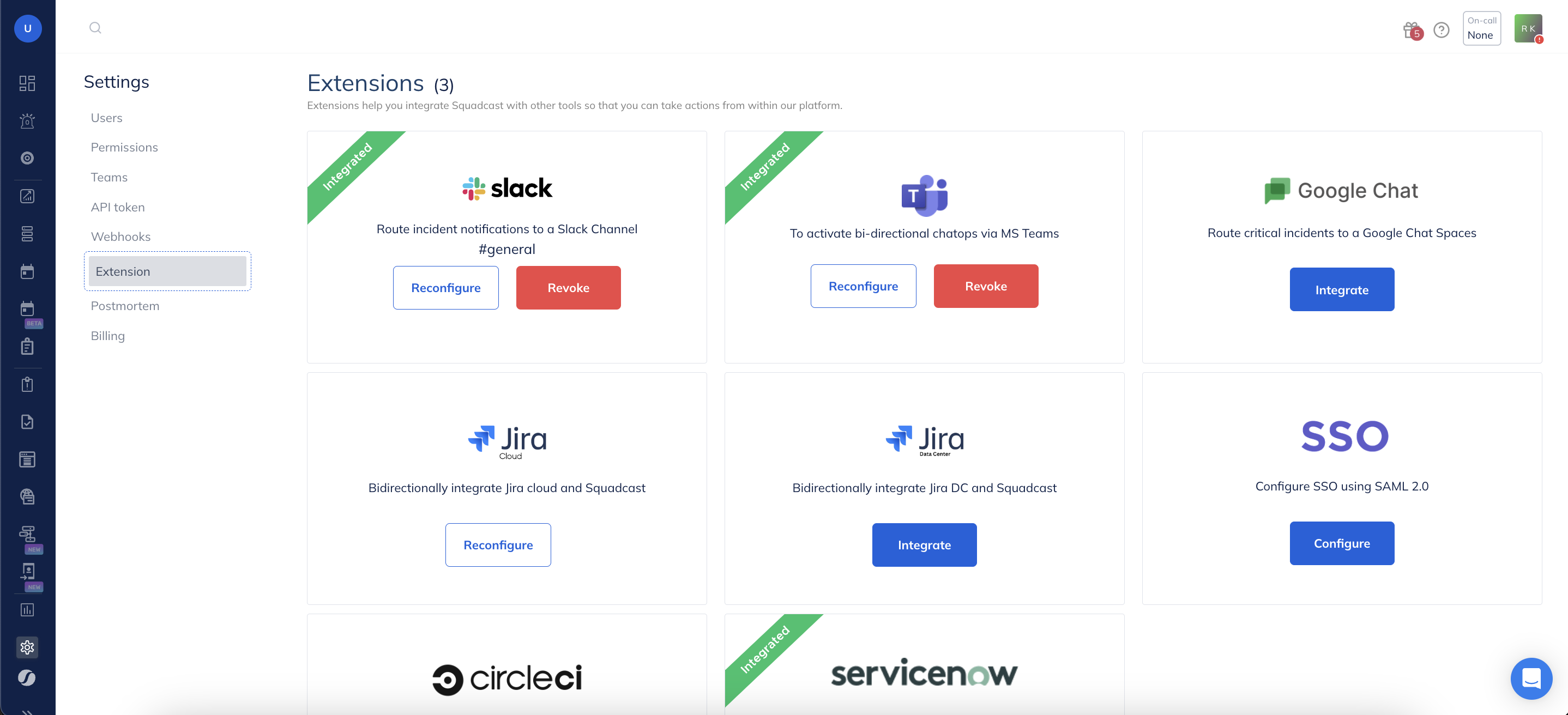 * Only the Account Owner and Users with the <mark style="color:red;">`Manage Extensions`</mark> permission will be able to enable, disable and manage Extensions in Squadcast