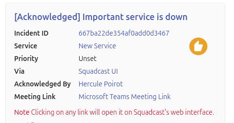 * The meeting links can be created in the channel where the incident message was posted. If the Org only has a default channel the meeting link will be created in that channel. If the Org has a Team-specific/Service-specific channel configured, the meeting link will be created in those channels.