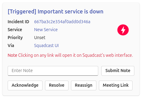 * You can <mark style="color:red;">`Acknowledge`</mark>, <mark style="color:red;">`Resolve`</mark> and <mark style="color:red;">`Reassign`</mark> incidents from within Microsoft Teams itself by clicking on the corresponding CTAs. In addition to this, you can also add notes to the incidents which will be directly reflected in the Incident Details page for the incident.