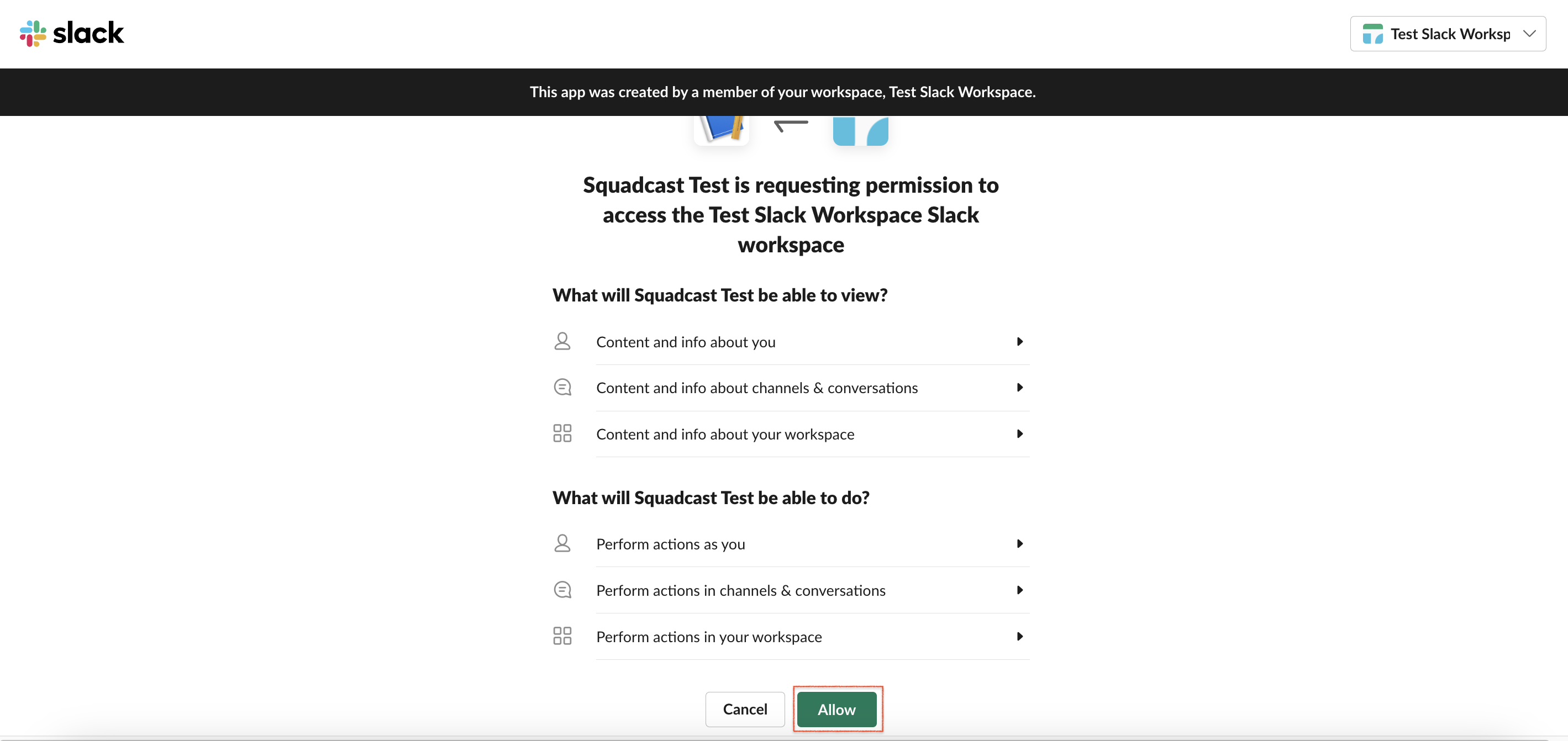 3. You will be redirected to Slack to approve specific permissions that Squadcast would need for this integration. Click on the Slack Workspace that you wish to integrate with your Squadcast account and then, click **Allow**.