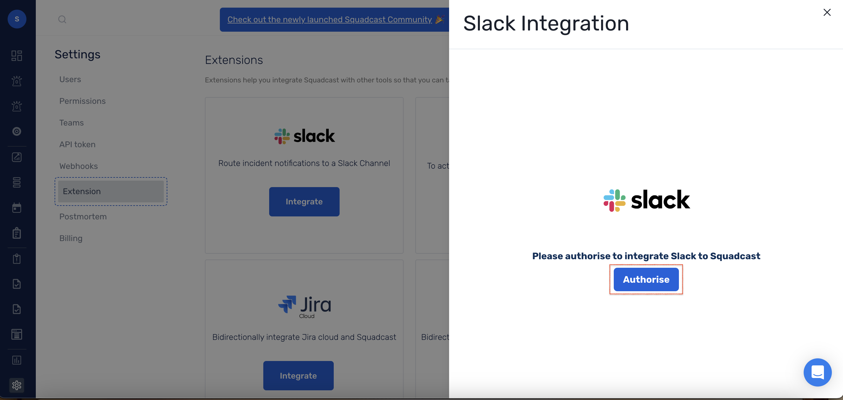 * Only the Account Owner and Users with the <mark style="color:red;">`Manage Extensions`</mark> permission can enable, disable and manage Slack extension in Squadcast.