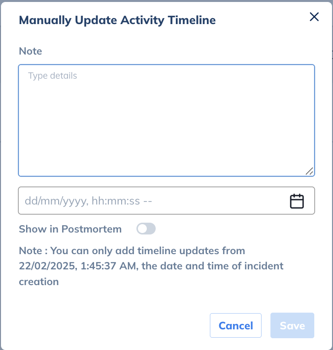 **Timestamp:** Select the timestamp that needs to be associated with the log entry. Based on the timestamp selected, this log will get placed accordingly either on top, at the end or in between other logs that are already present (chronological order). Timestamp selection cannot be at a date and time that is prior to the incident being triggered.