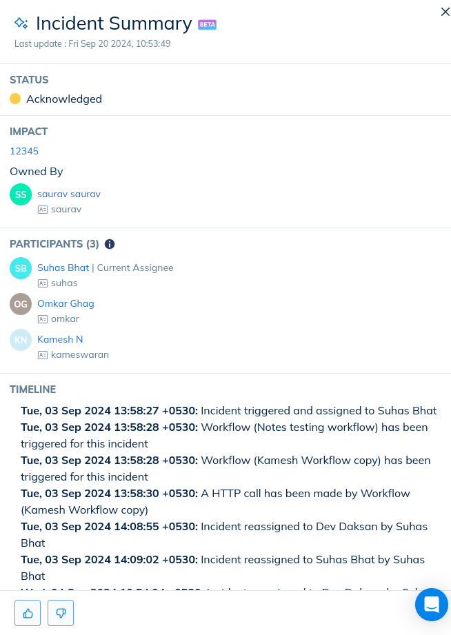 This feature is currently a beta offering. Feel free to share your feedback with us and we will be happy to engage and discuss the same. You can also optionally either upvote or downvote on the summaries generated for incidents and let us know via the prompt shown as to why you did not like the summary generated, in case of a downvote.