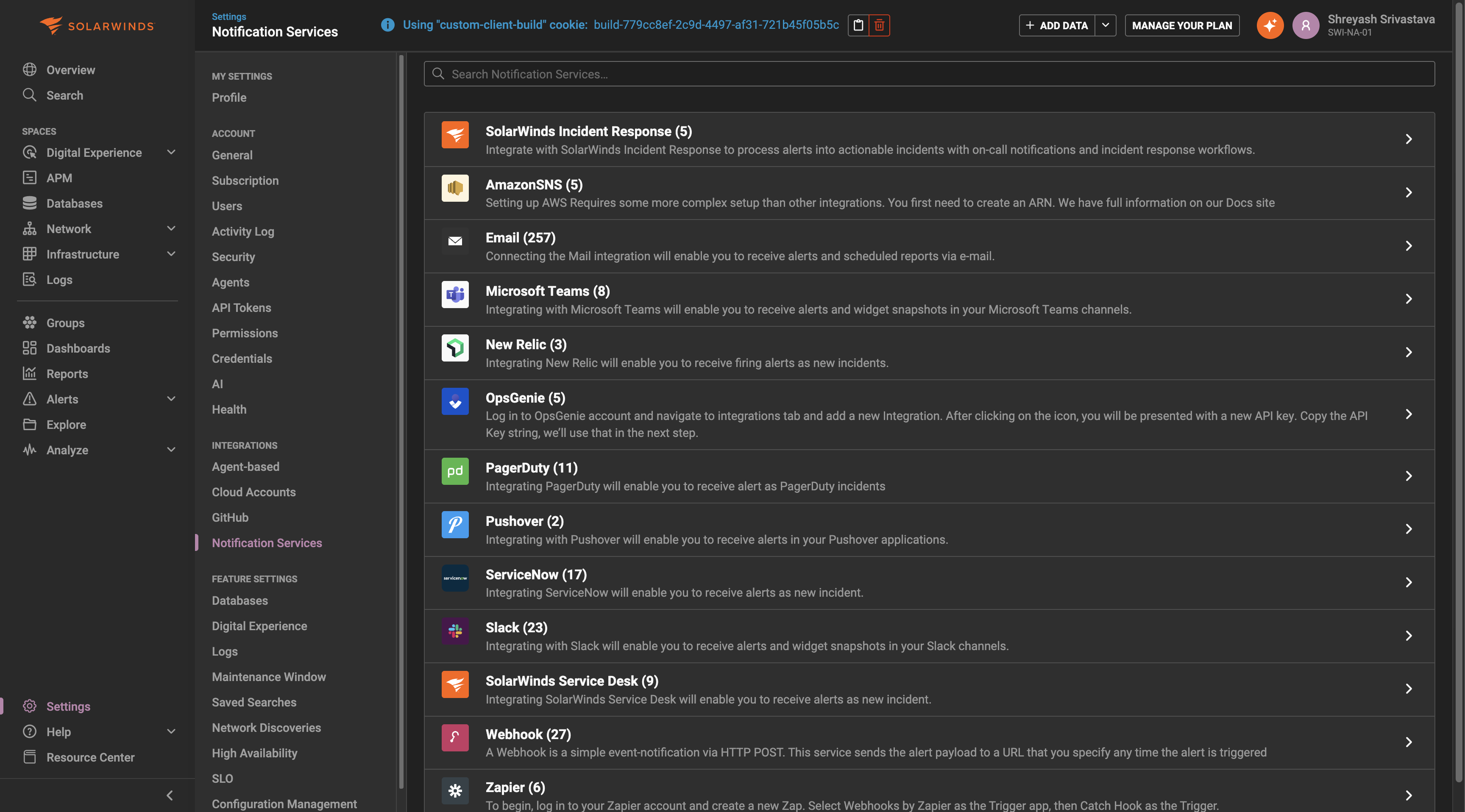 Navigate to **Settings** in the sidebar, select **Notification Services** and select **SolarWinds Incident Response.**