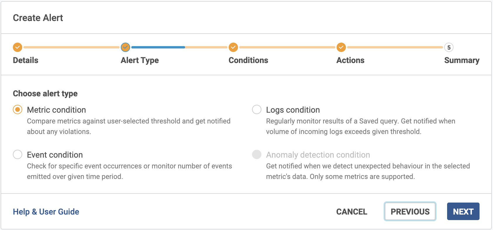 b. Select Metrics (Entity or Metric Group), Logs or Events (Kubernetes or Database) condition. Please note we do not support Anomaly condition alerts.