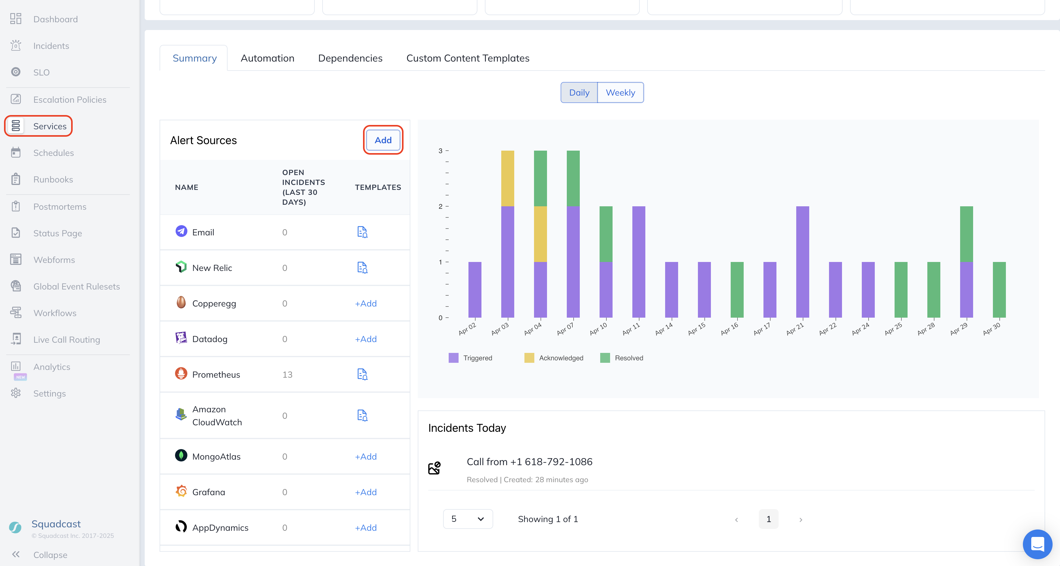 Navigate to **Services** -> **Service Overview** -> select or search for your Service. In the **Alert Sources** section, click **Add**.