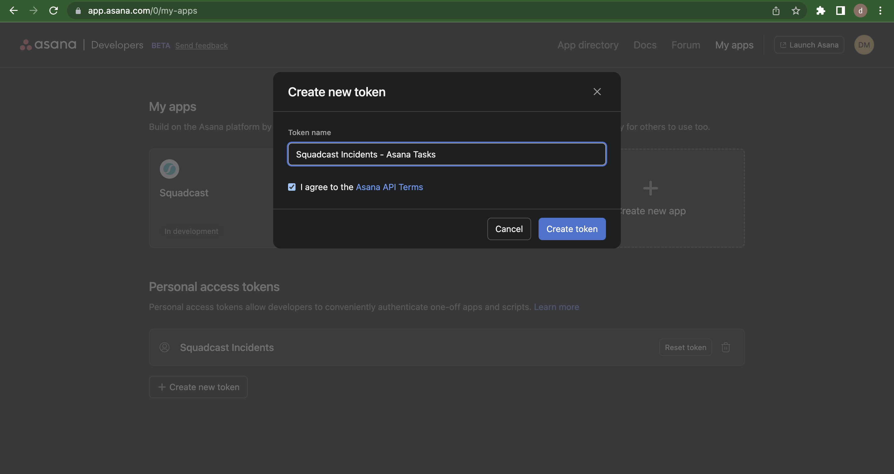 1. Login to <https://app.asana.com/0/my-apps> -> Under **Personal Access Token** -> **Create new token** -> Enter the details and **Create Token**