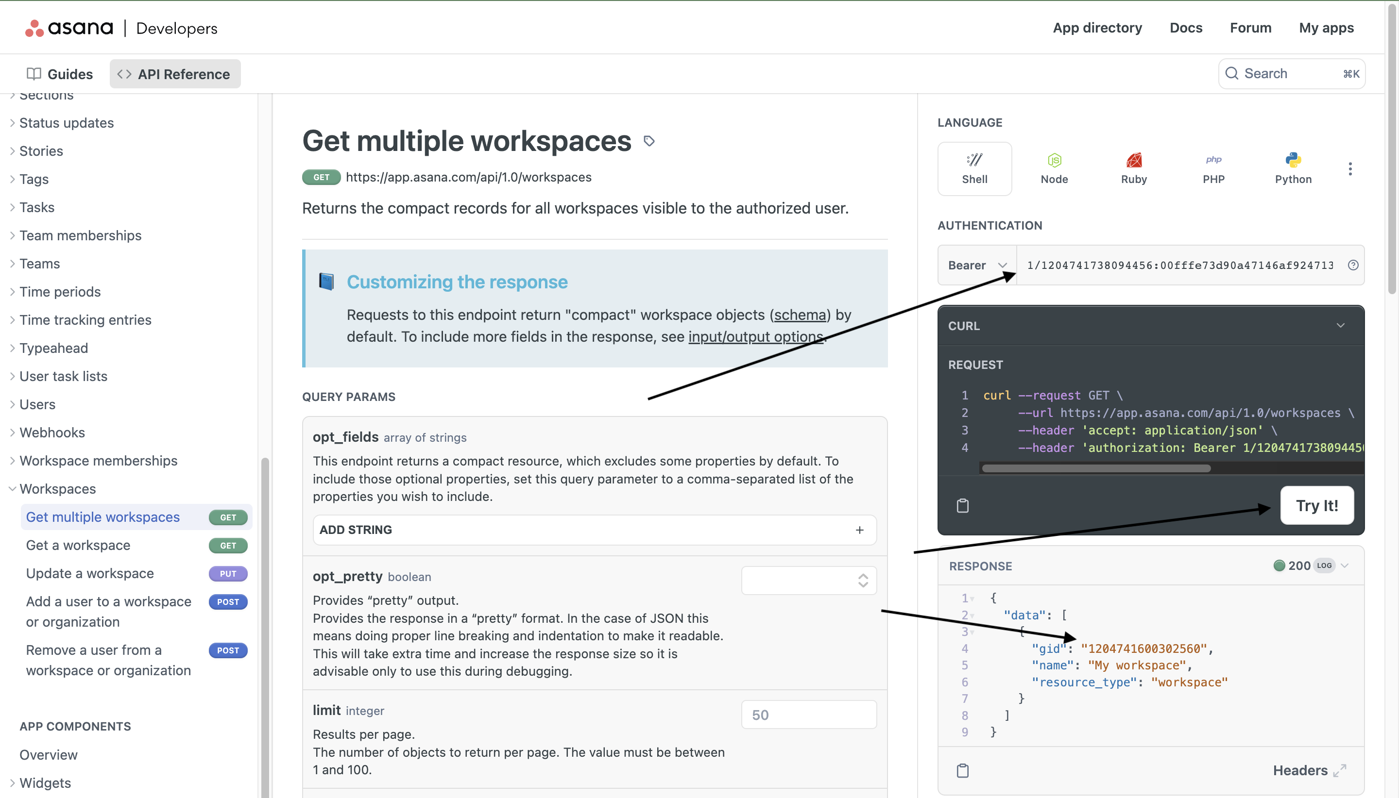 1. Open <https://developers.asana.com/reference/getworkspaces> to get the Workspace ID.