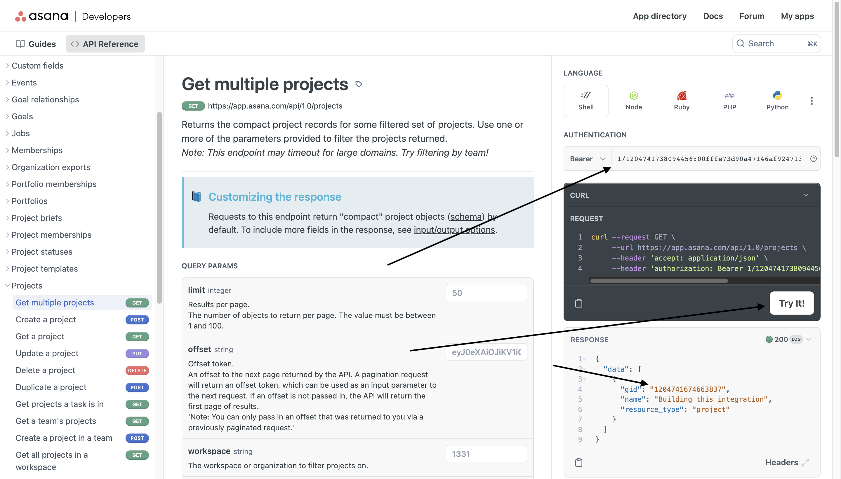 4. Open <https://developers.asana.com/reference/getworkspaces> to get the Project ID.