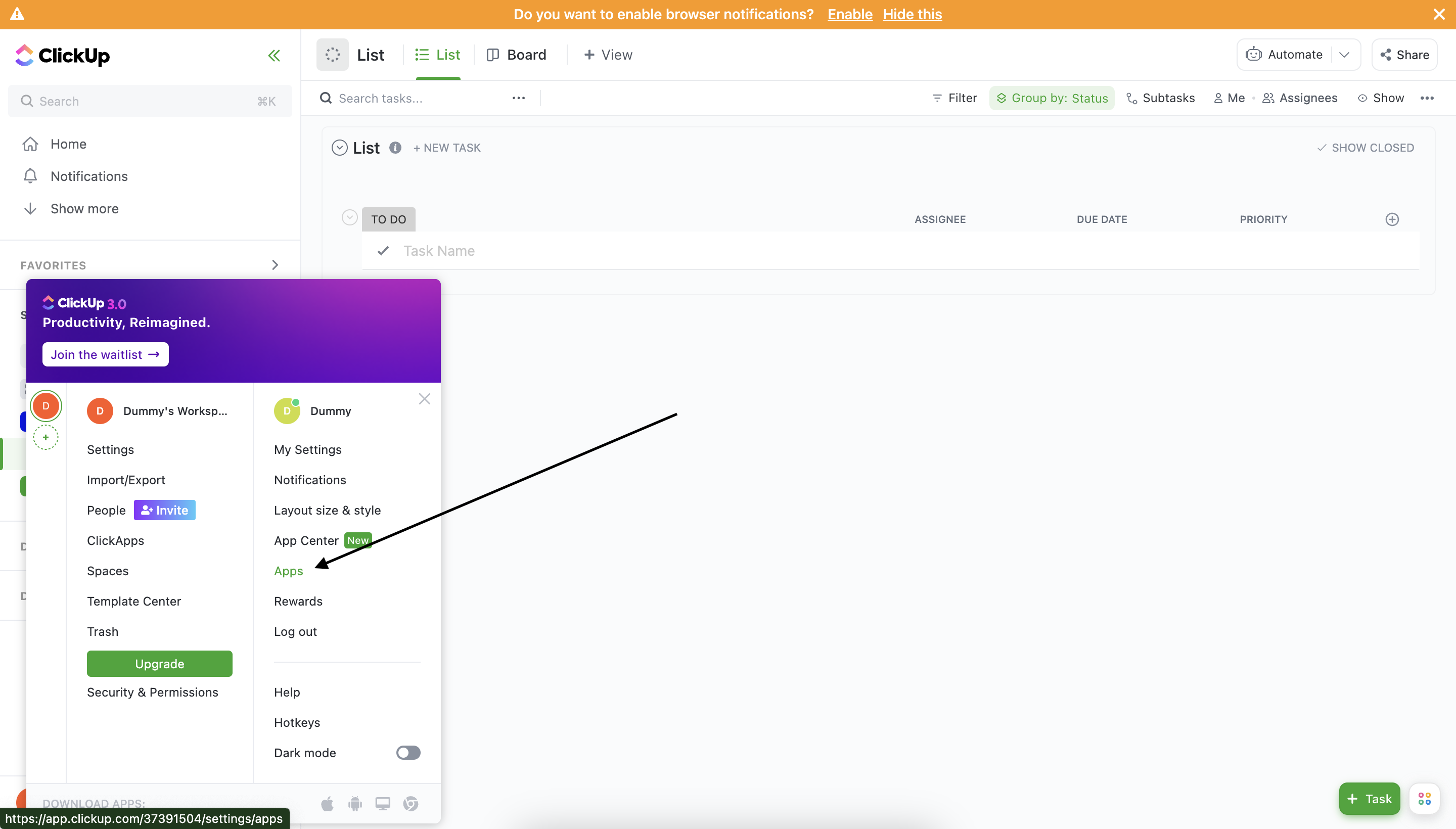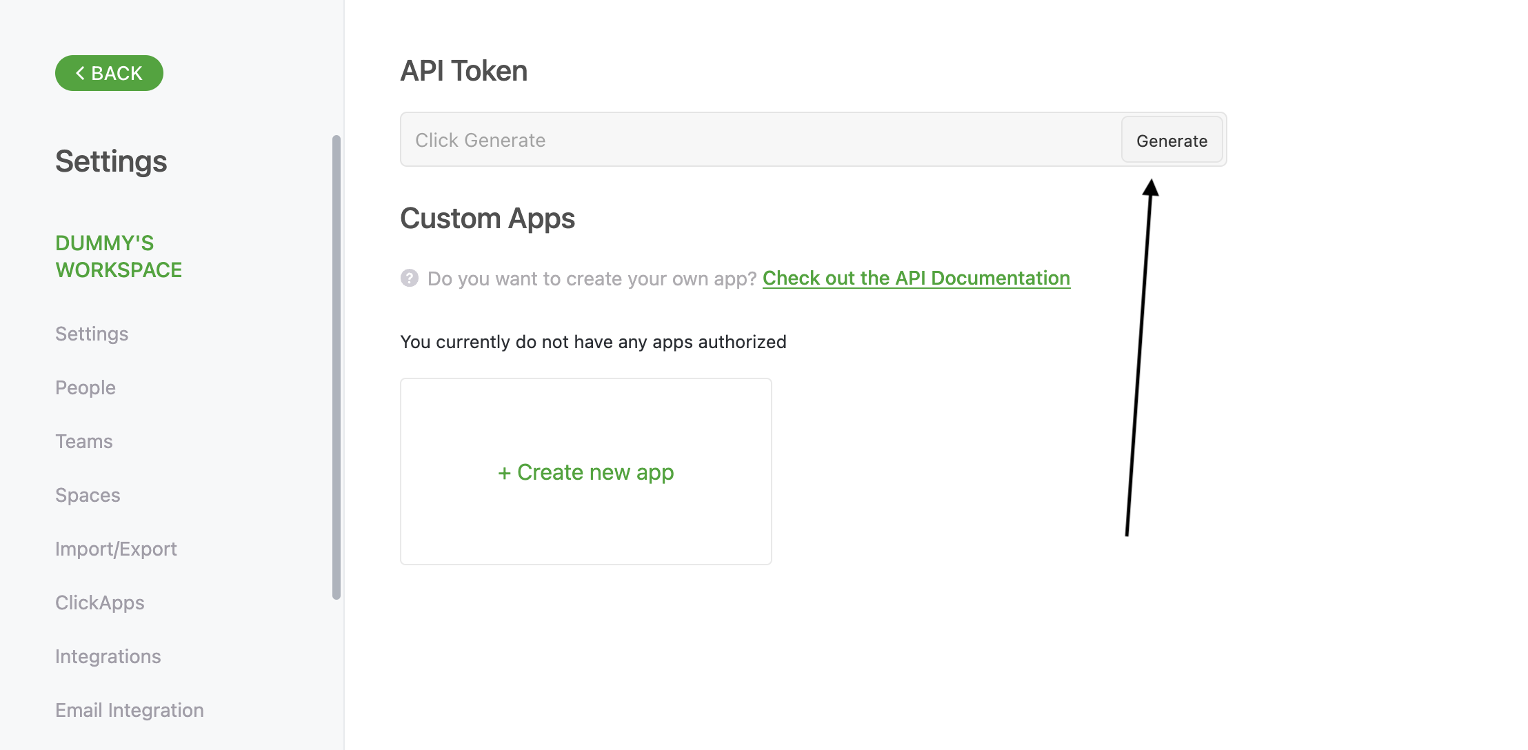 1. Login to your ClickUp account -> Go to **Your Profile** at the left bottom-> **Apps** -> Under **API Token** -> **Generate**