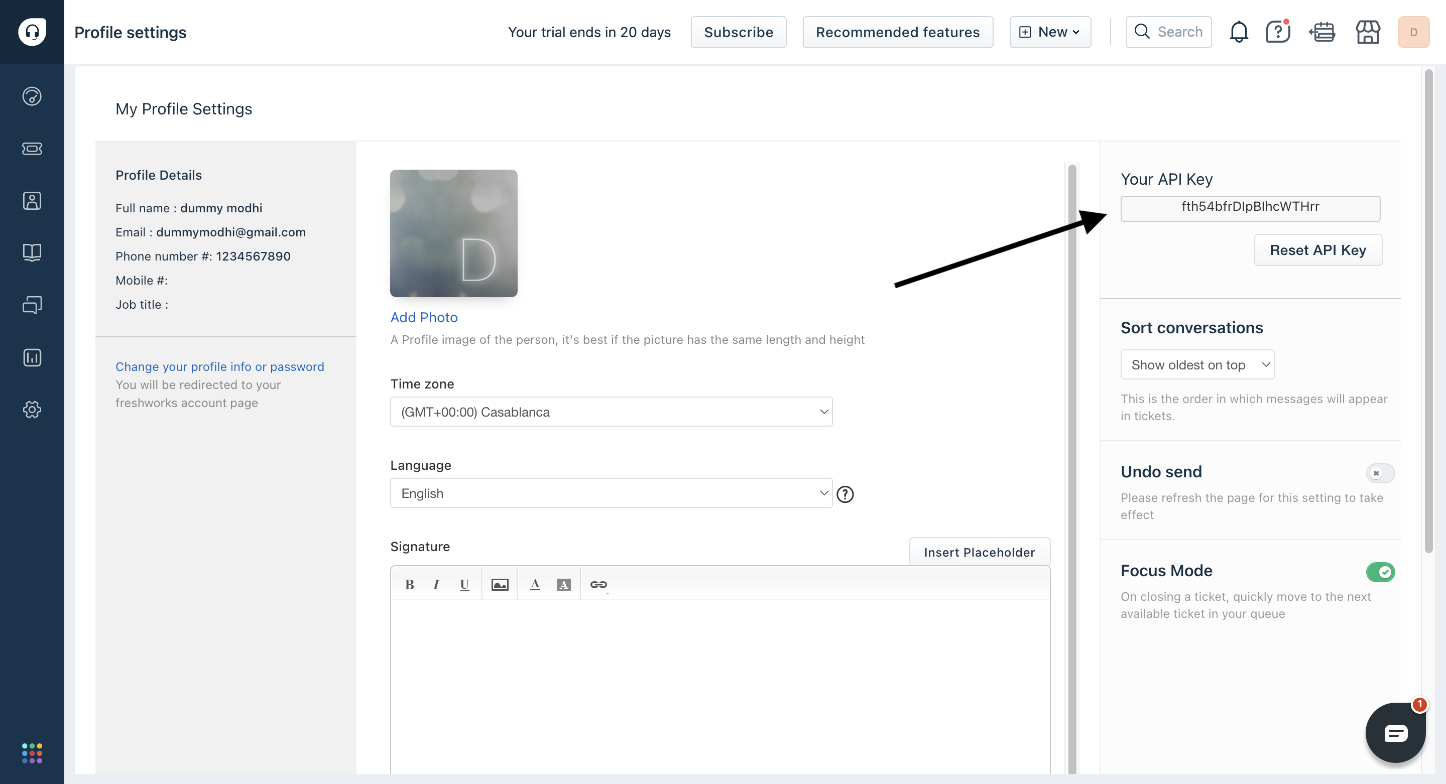 2. Copy the **API Key** from Freshdesk to Create Tickets