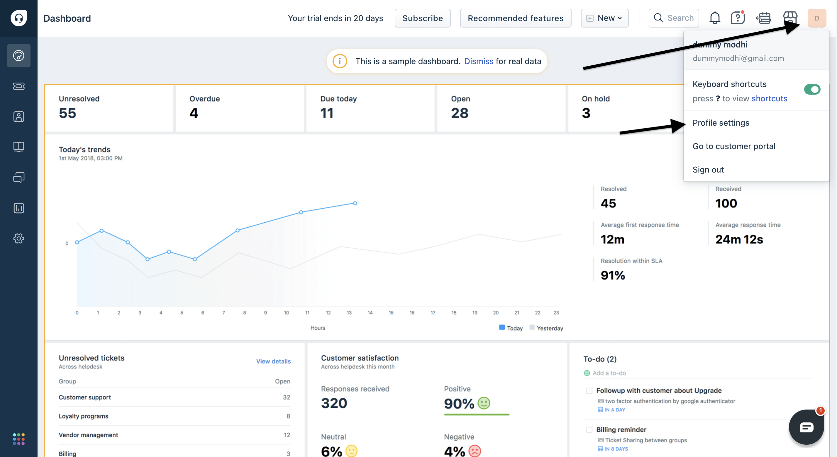 1. Login to your **Freshdesk Support Portal** -> your **Profile** (top right) -> **Profile Settings** -> **View API Key**