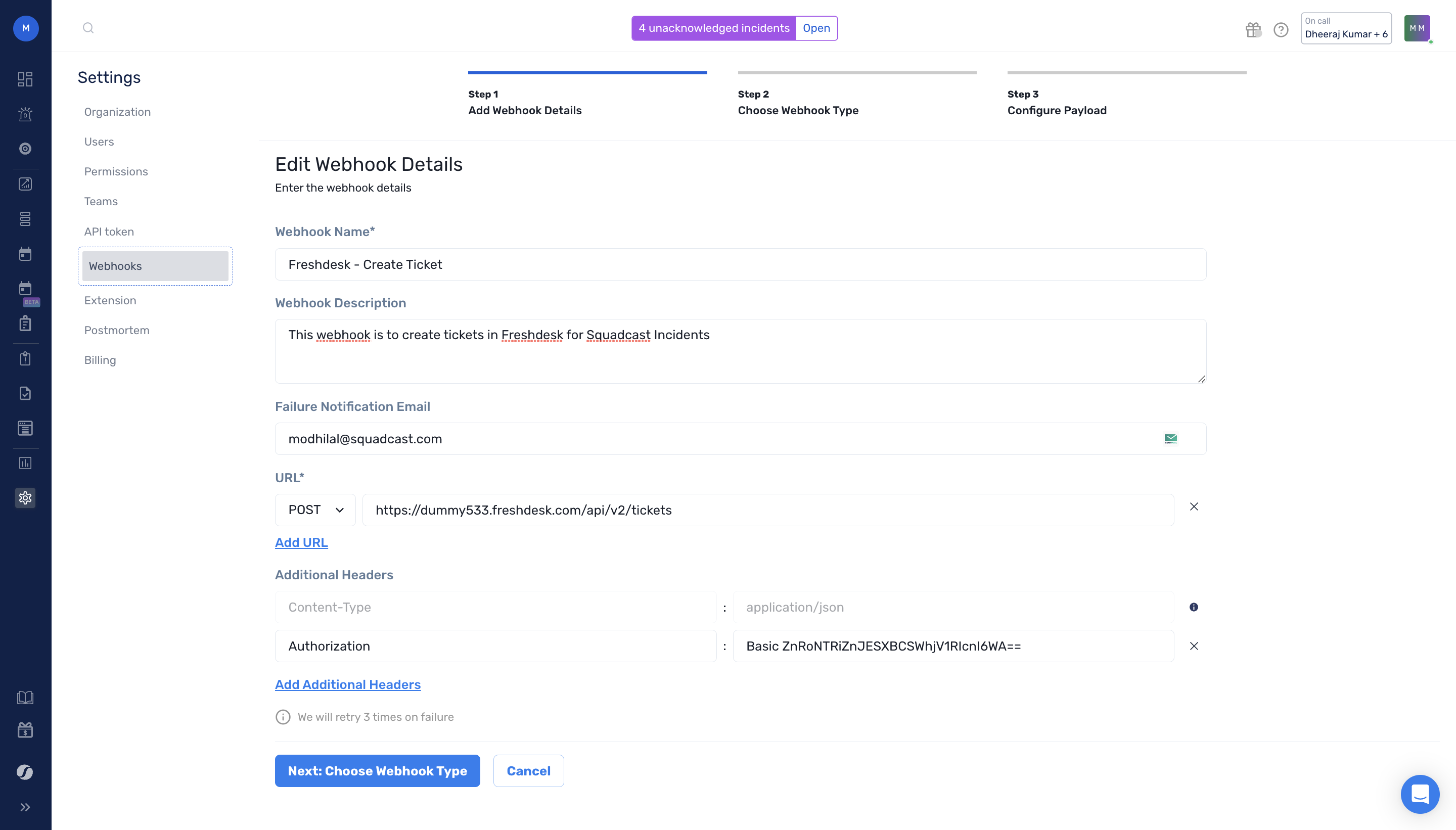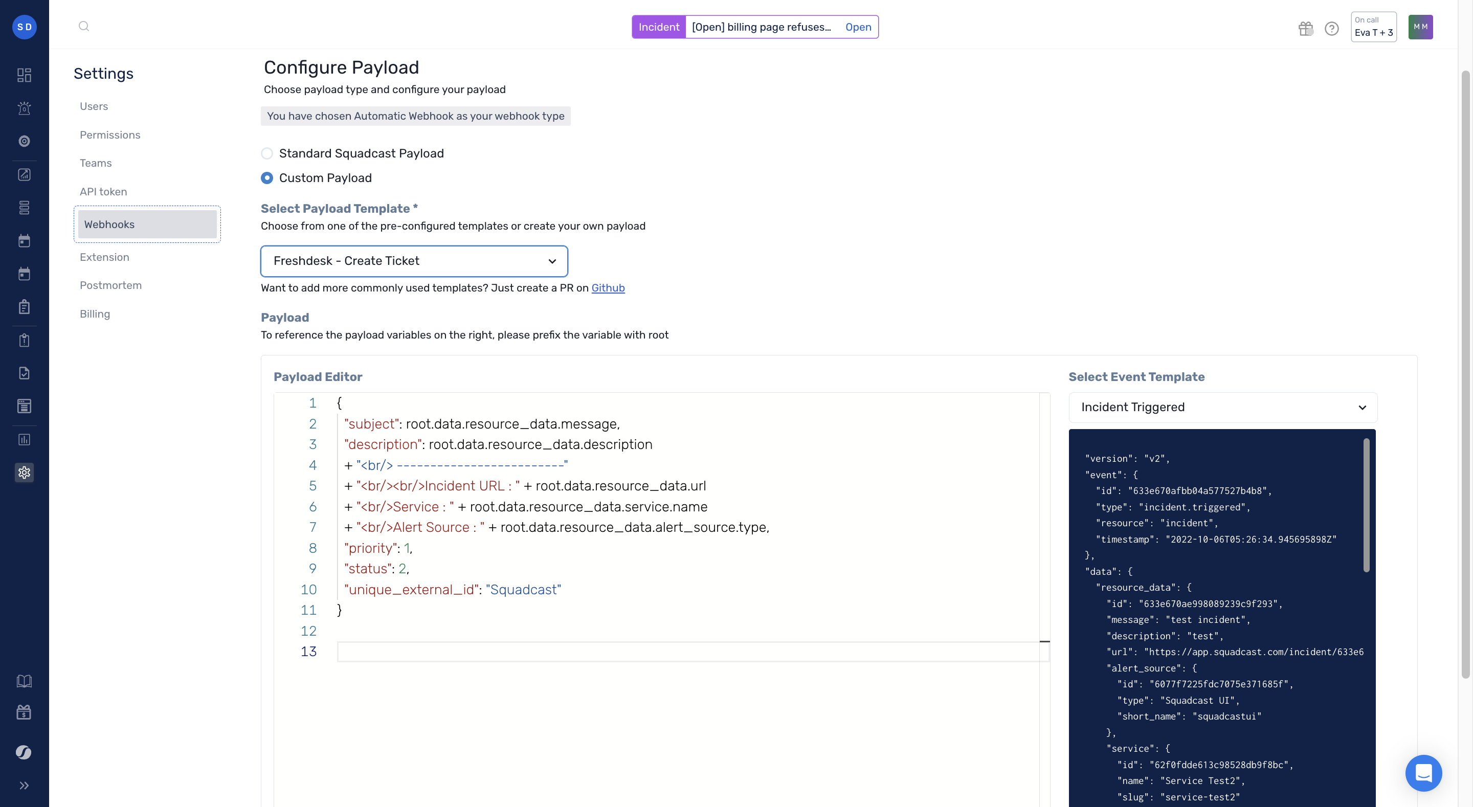 ## Using Webhooks to create Freshdesk tickets for Squadcast Incidents