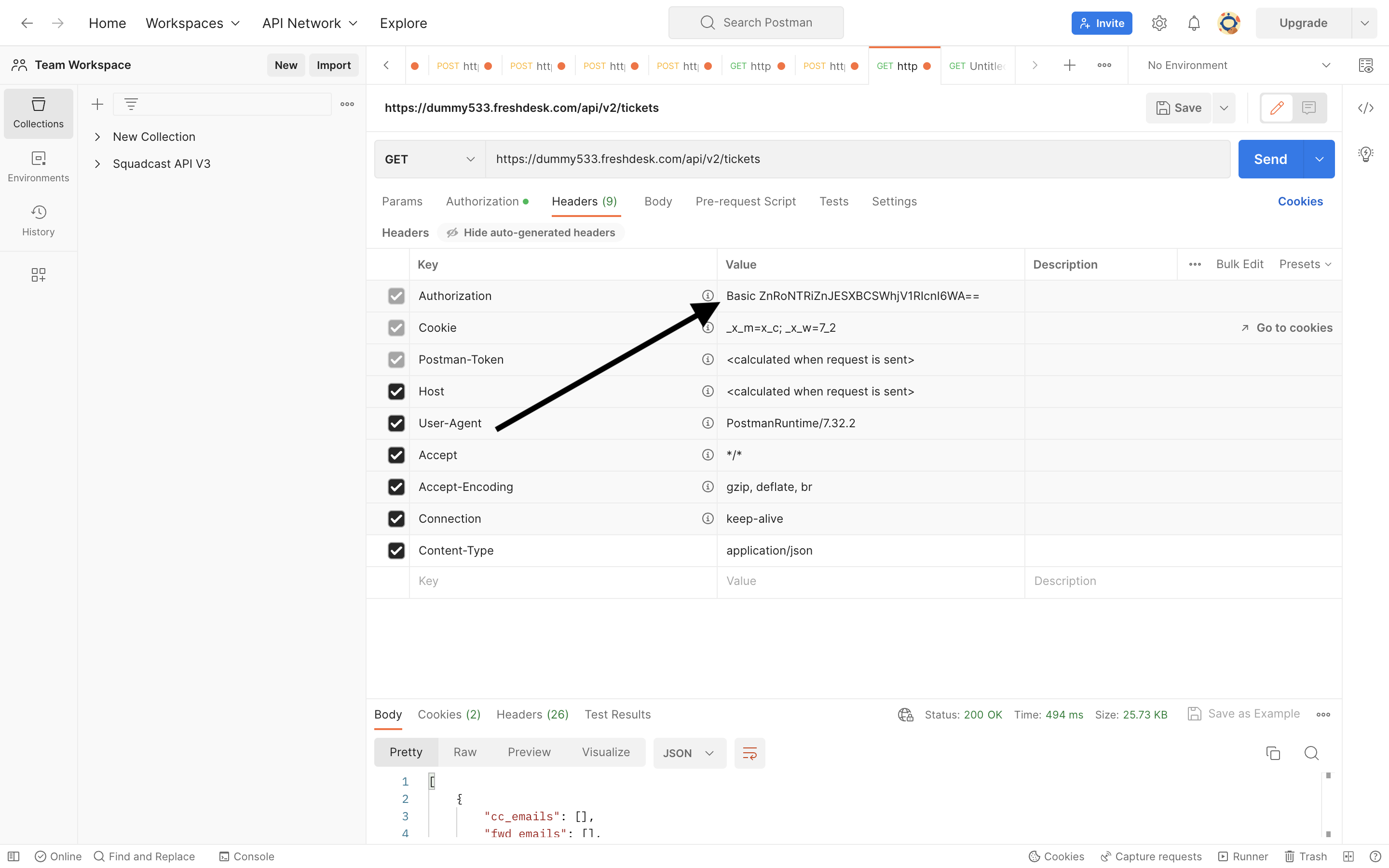 4. Navigate to **Headers** -> Key **Authorization** -> Copy the **Value**
