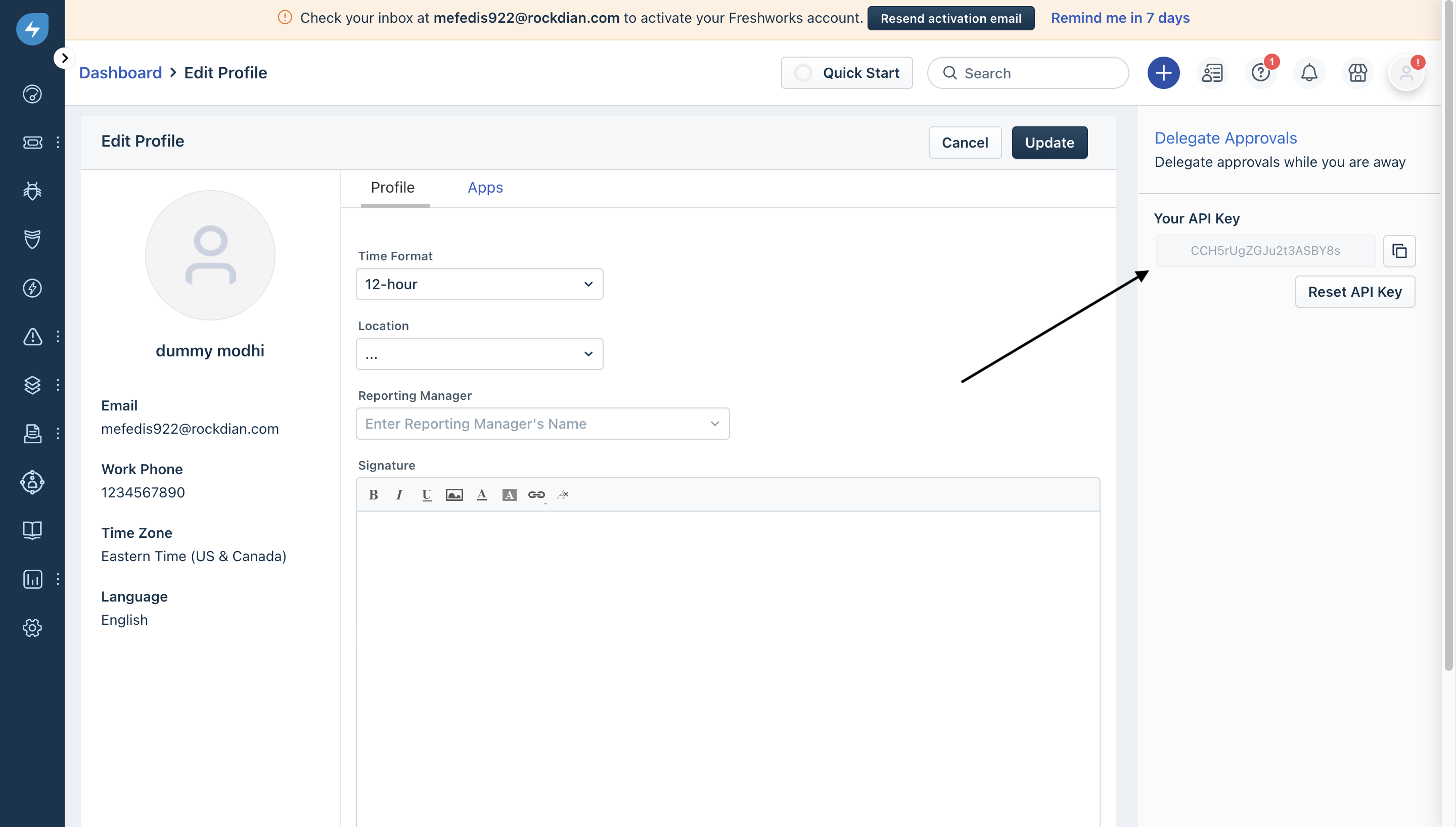 2. Copy the **API Key** from Freshservice to Create Tickets