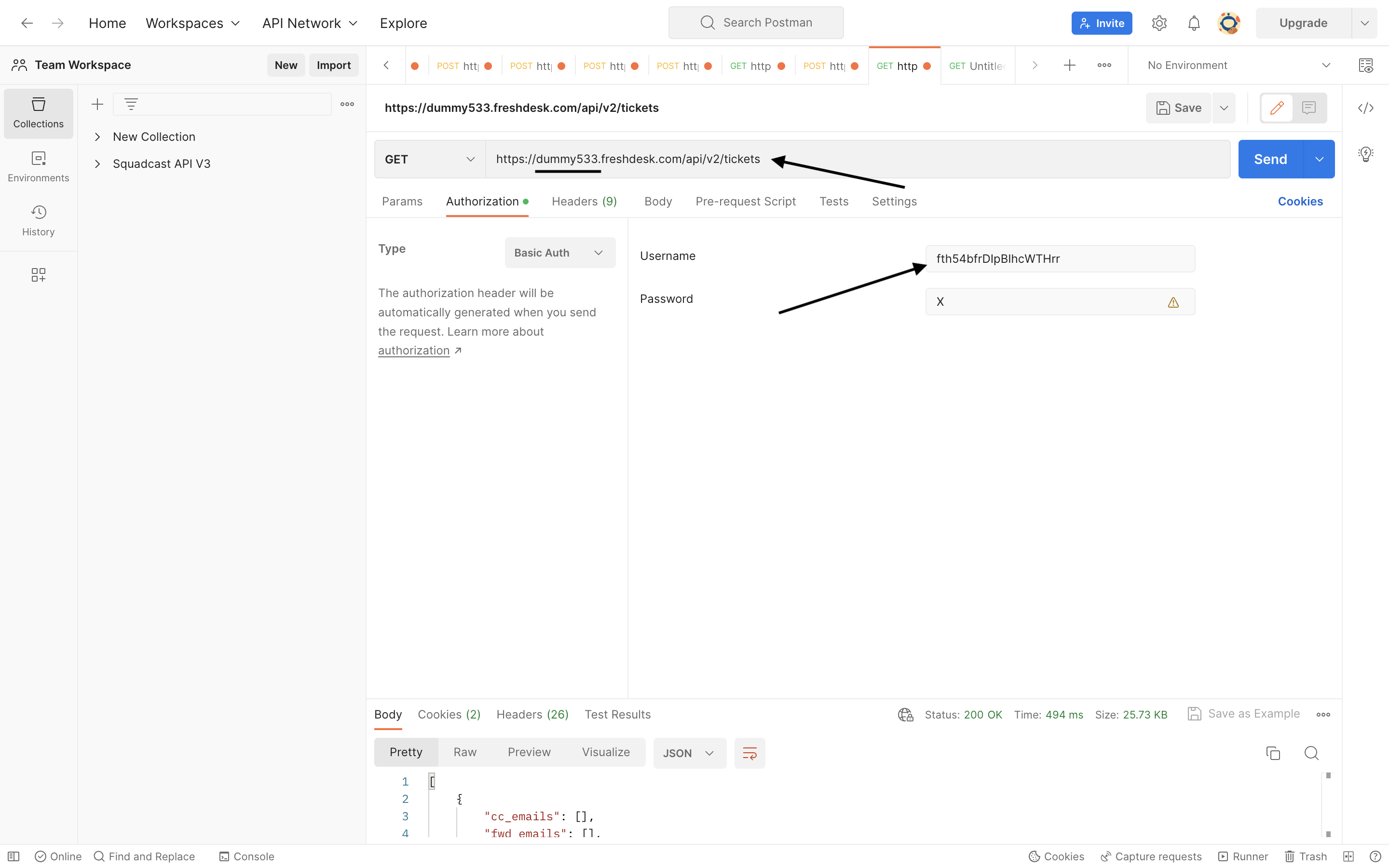 3. Navigate to **Authorization** -> Type **Basic Auth** -> In the **Username** field paste the **API Key** copied from the profile page.