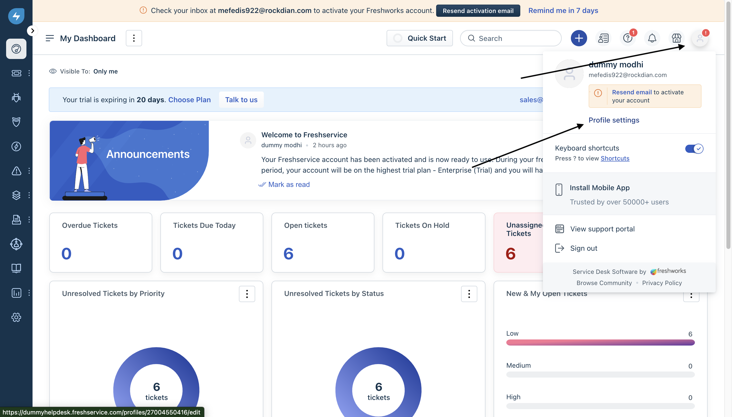 1. Login to your **Freshservice Portal** -> your **Profile** (top right) -> **Profile Settings** -> **View API Key**