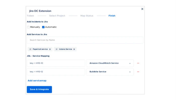**Add Services to Jira:** If an incident is created for any service selected in this section, a corresponding Jira ticket would be created in the configured *project* having the configured *issue type*.
