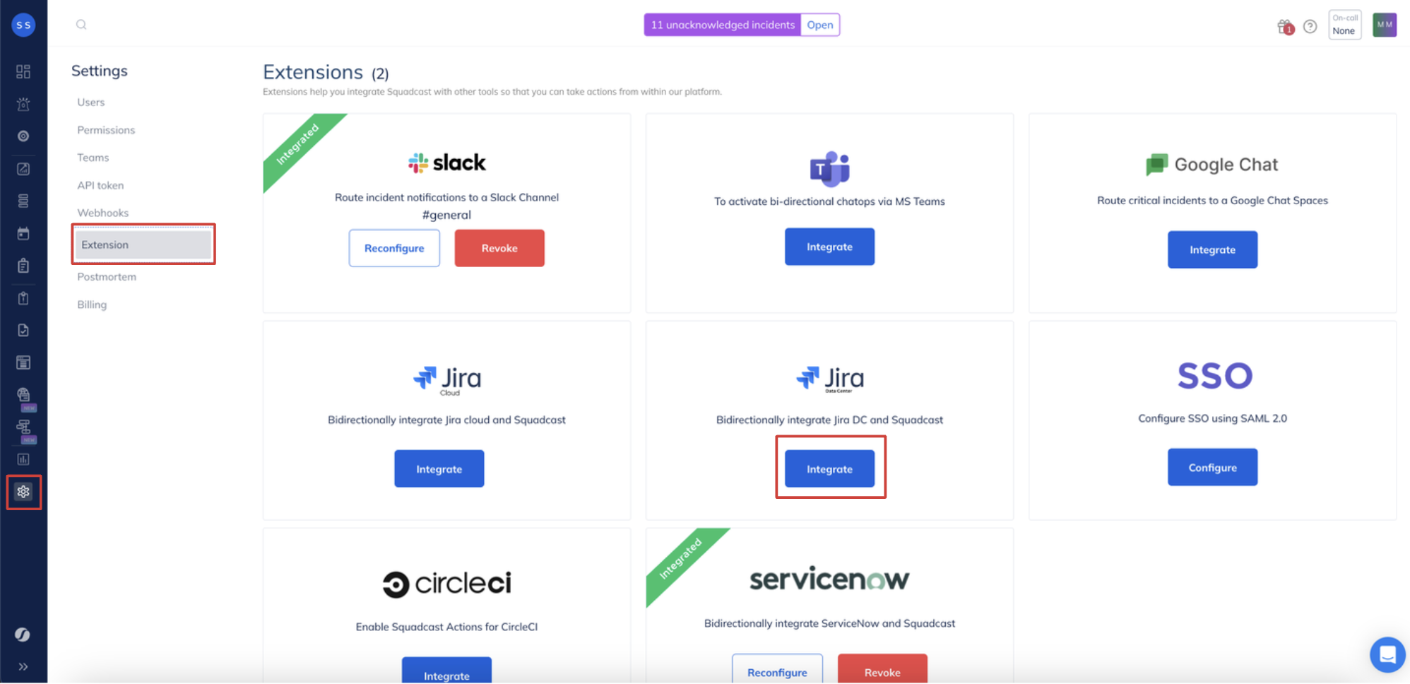 1. In Squadcast, navigate to **Settings** and select the **Extensions** tab from the left navigation sidebar. Move over to the JIRA Cloud extension and click on **Integrate**