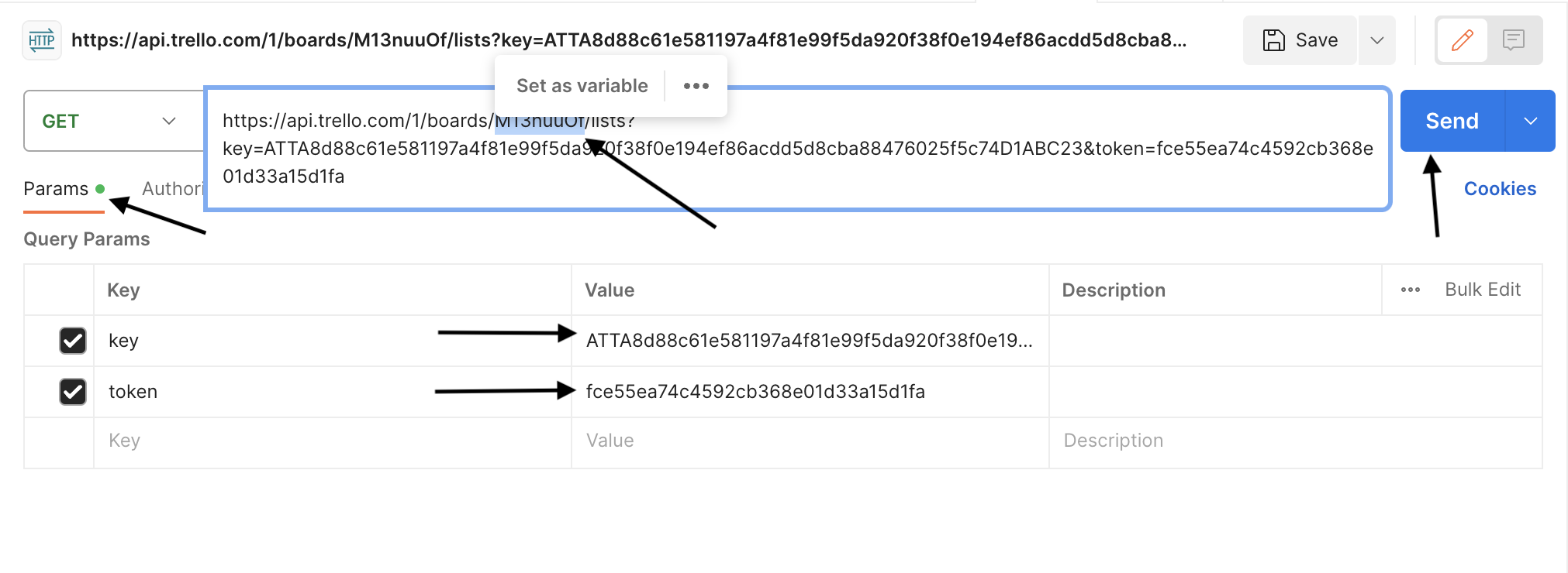 3. Paste the API Key and Token in the Params section and replace {id} with your workspace id in the URL and click on Send to get the Lists