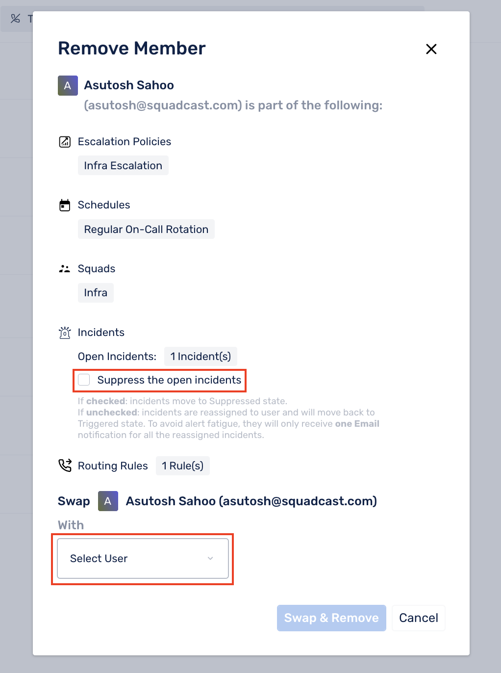 7\. Once the appropriate replacement Team member is selected and action for incidents is determined, click on **Swap & Remove.**
