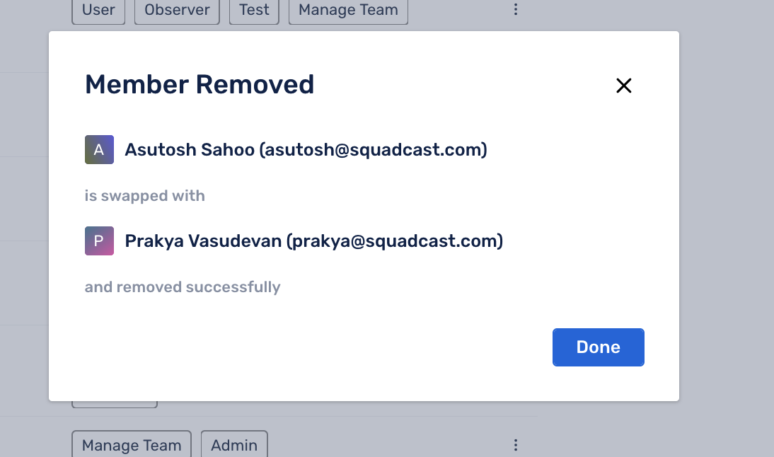 5\. If the Team member to be removed is a part of any of the entities (Incidents, Escalation Policies, Schedules) that belong to the Team, a modal displaying those details will appear