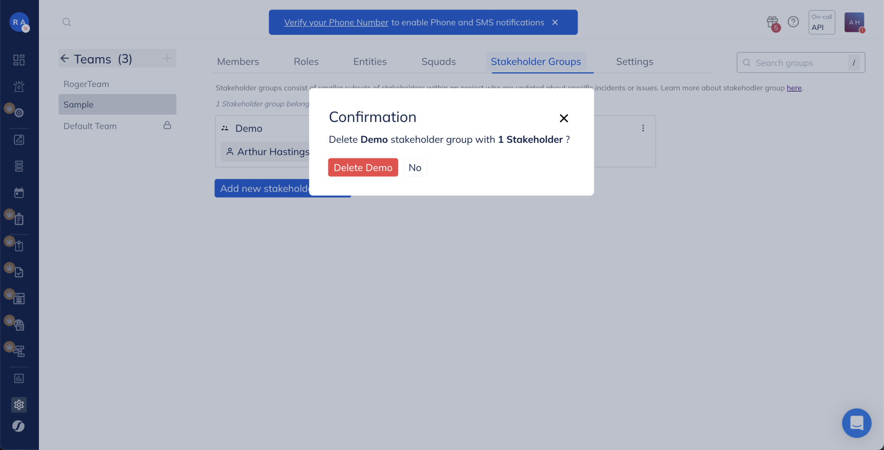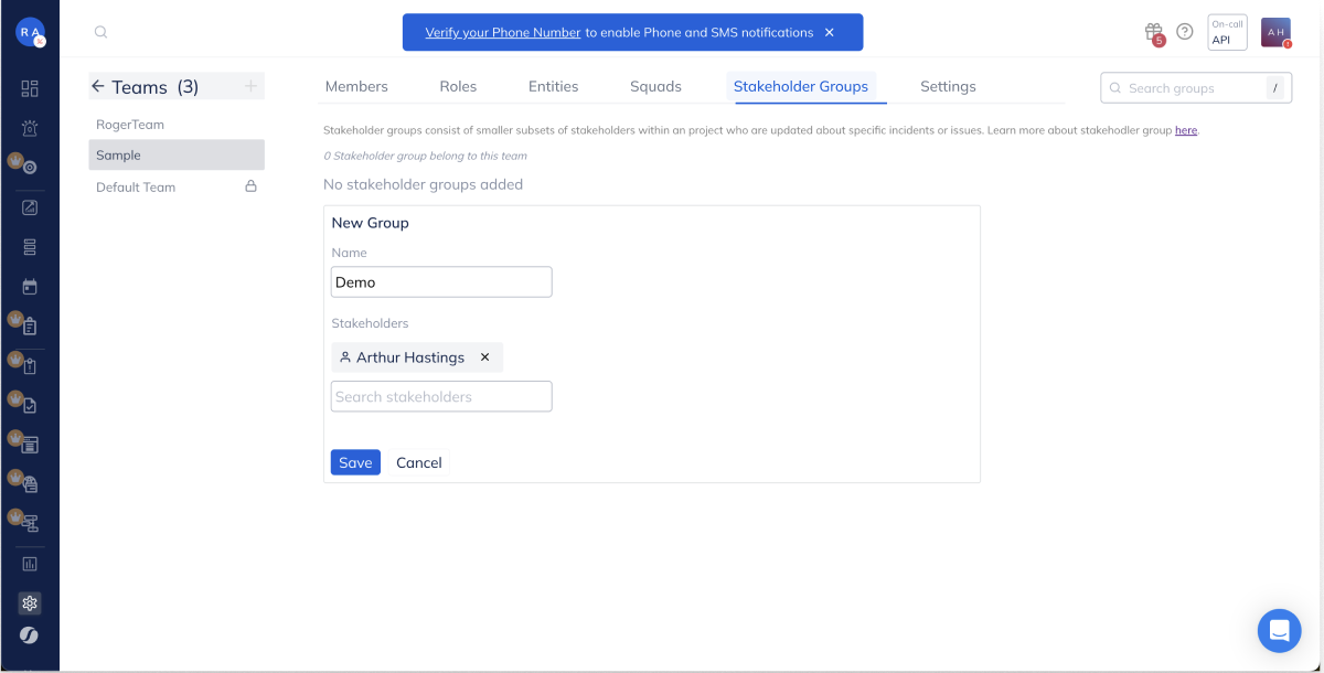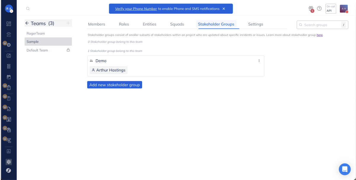 Stakeholder Groups serve as distinct collectives of stakeholders within a Team, designated to receive notifications concerning incident progress. When tagged via @mentions in incident notes, these stakeholders also get added as incident watchers for real-time updates on the progress of incidents.