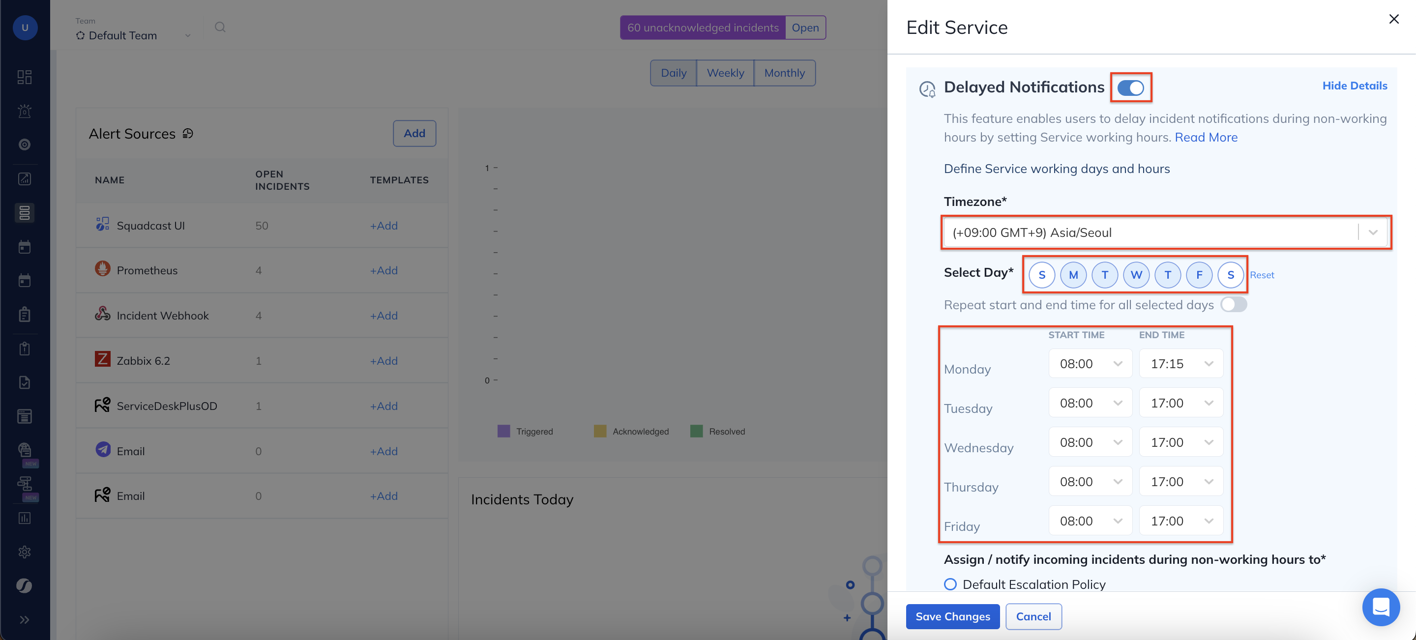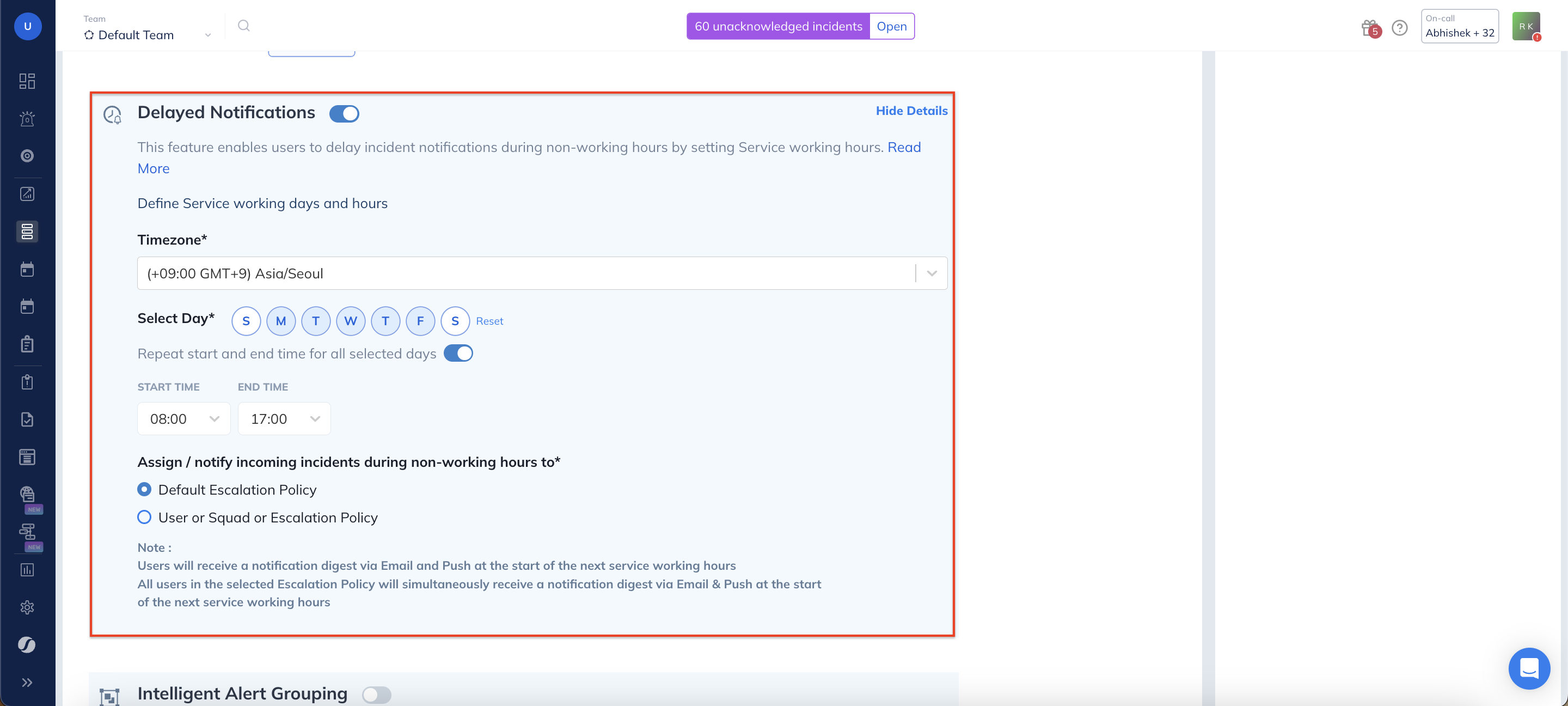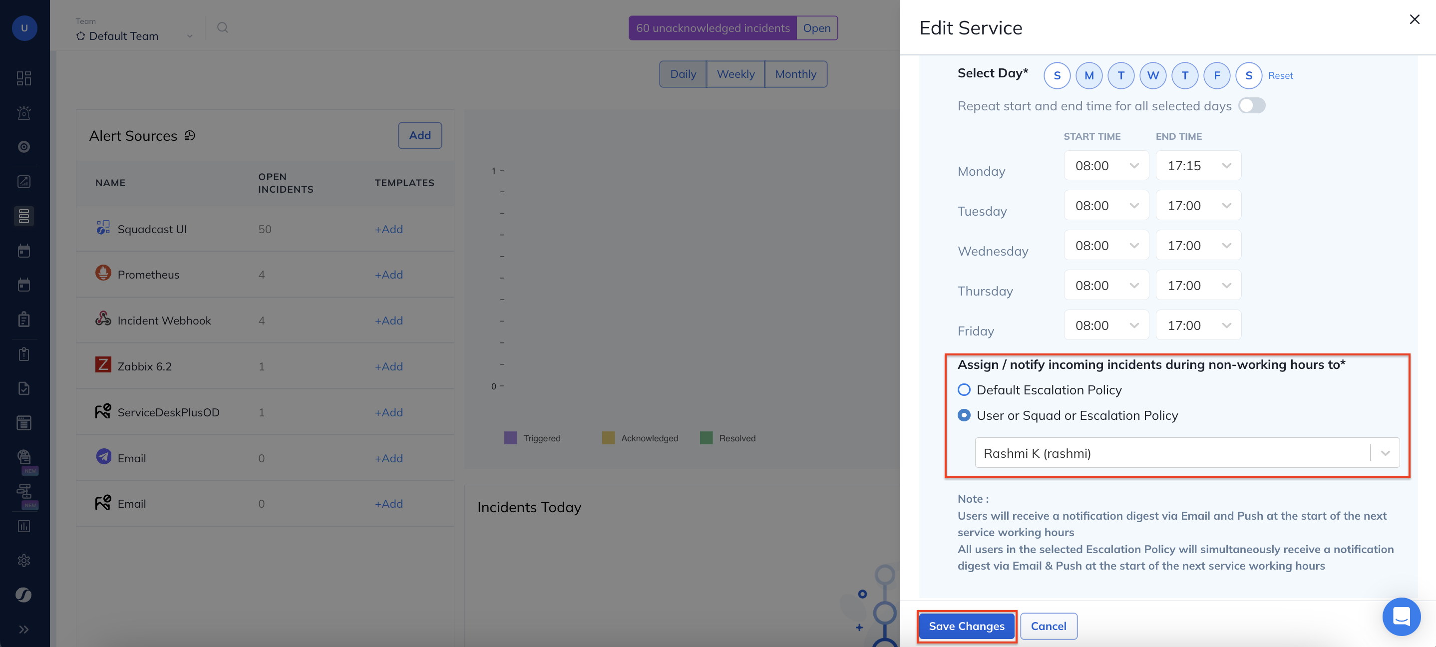 If for any reason you want to set your Service business/working hours as “all time”, then simply disable the toggle. With this, for any new incoming incident, notifications will be sent out to the default assigned entity (User, Squad, or Escalation Policy).