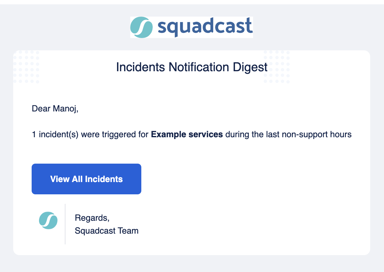 1. All users in the selected Escalation Policy will simultaneously receive a notification digest via Email & Push at the start of the next Service working hours. Please note that escalations will not be followed in the traditional sense of regular incident notifications.