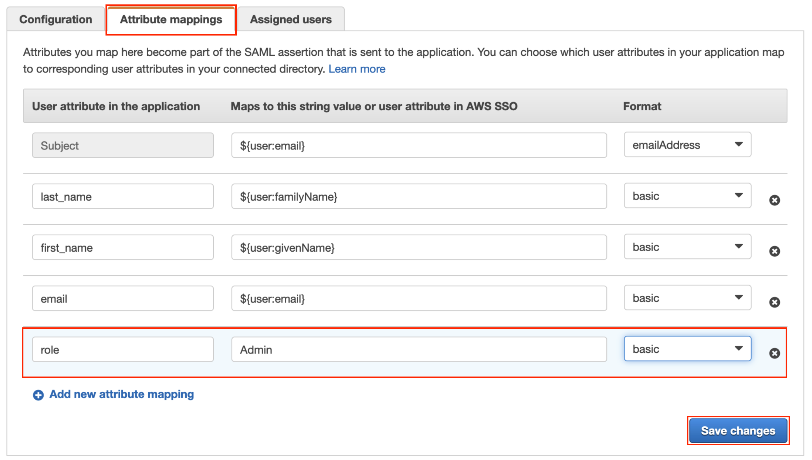 * Switch to the **Attribute mappings** tab and create mappings as shown in the screenshot below and click on **Save changes**