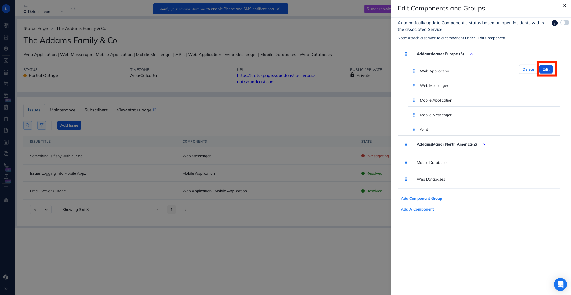 2. Click on **Edit** for the component whose timeline you want to edit